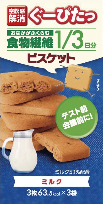 水分を含むと膨らむ食物繊維のグルコマンナンや豆乳由来のたんぱく質を配合し、砂糖や糖類不使用の「ぐーぴたっ 豆乳ビスケット」は、「キレイになりたい」気持ちを応援するブランンド。おなかの「ぐー」を「ぴたっ」と止めるためにOLが仕事中のデスクの中に常備したり、仕事終わりのフィットネスに行く前に利用するなど、カバンの中にお守りのようにして入れておく食品として定着しています。また、発売当時は女子高生だった女性が、27年の歳月を経て、現在では中年太りを気にする夫・パートナーの間食用や子どもの塾に行く前の軽食としても利用するなど、愛用者は女性だけにとどまりません。また、忙しく、食事がない時や、災害時の非常食としても利用されるなど、用途は広がりを見せています。