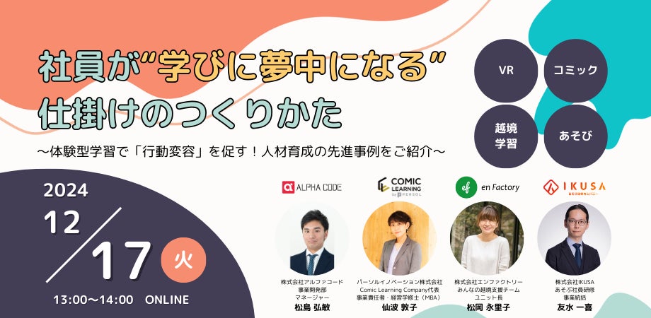 株式会社エンファクトリー(東京都千代田区、代表取締役社長CEO加藤健太、以下、弊社)は、株式会社アルファコード(東京都港区、代表取締役会長 兼 社長武市智行)、パーソルイノベーション株式会社(東京都港区、代表取締役社長大浦征也)、株式会社IKUSA(東京都豊島区、代表取締役赤坂大樹)とともに、2024年12月17日(火)13:00~に、『社員が“学びに夢中になる”仕掛けのつくりかた~体験型学習で「行動変容」を促す!人材育成の先進事例をご紹介~』を開催いたします。(イベントページ:https://form.k3r.jp/enfactory/20241217_LD?k3ad=enfactory)