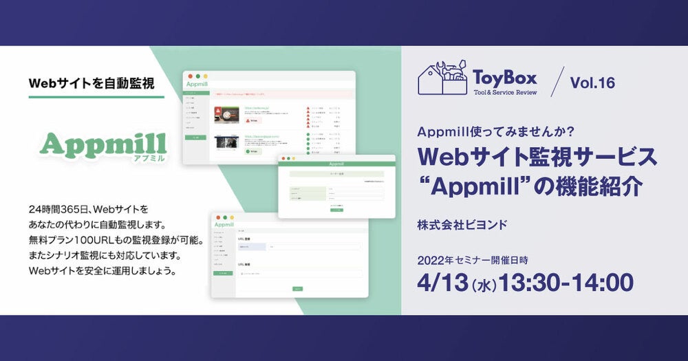 2022/4/13(水)ToyBox Vol.16【無料】Webサイト監視サービス “Appmill”の機能紹介