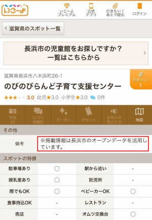 2021年11月より、長浜市の「子どもとおでかけ向け」施設のオープンデータを利用しています。データは「いこーよ」のサイトおよびスマホ向けアプリの「おでかけ」情報欄に掲載され、どなたでも無料でサービスをご利用いただけます。なお、情報欄にはオープンデータを利用している旨記載されます。