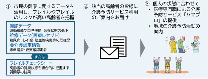 市民の健康に関するデータを活用し、フレイル※1等の高齢者を把握し、身体機能や栄養状態、口の機能の低下が心配される方に対して一人ひとりの健康課題に合わせた介護予防サービスを提供することで、多くの高齢者が自立した生活を送ることができるように取り組みを実施します。