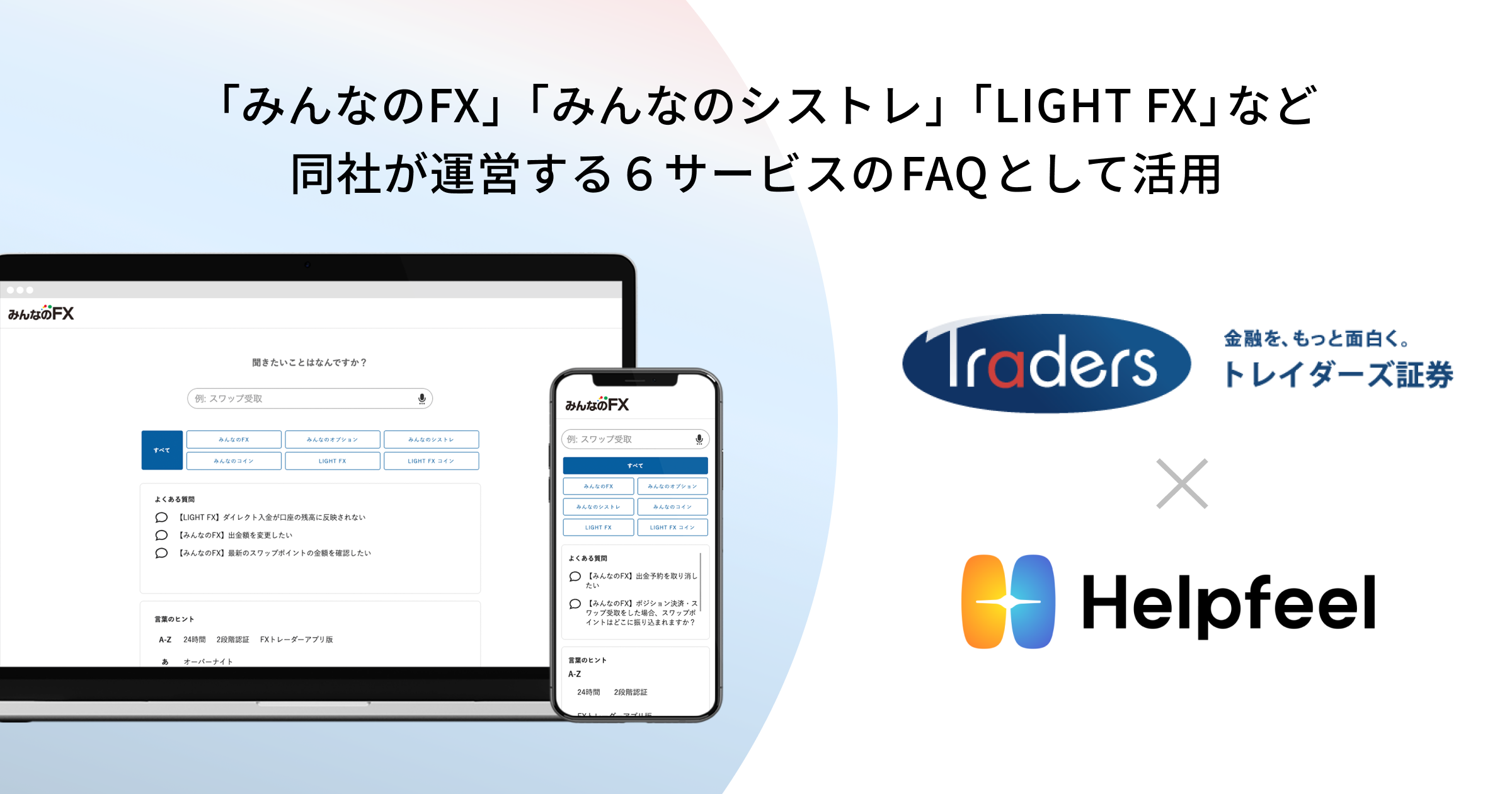 現在、トレイダーズ証券には電話とメールで月に3,000〜4,000件寄せられる問い合わせを社内だけで対応していますが、今後も利用者の増加が予想されるなか、お客様が自己解決できる環境を構築するソリューションとして「Helpfeel」の導入を決定しました。同社の「個人投資家の皆様に、機関投資家に負けない投資環境を提供する」という経営方針のもと、トレイダーズ証券が運営する「みんなのFX」「みんなのオプション」「みんなのシストレ」「みんなのコイン」「LIGHT FX」「LIGHT FX コイン」6サービスのFAQを強化します。
