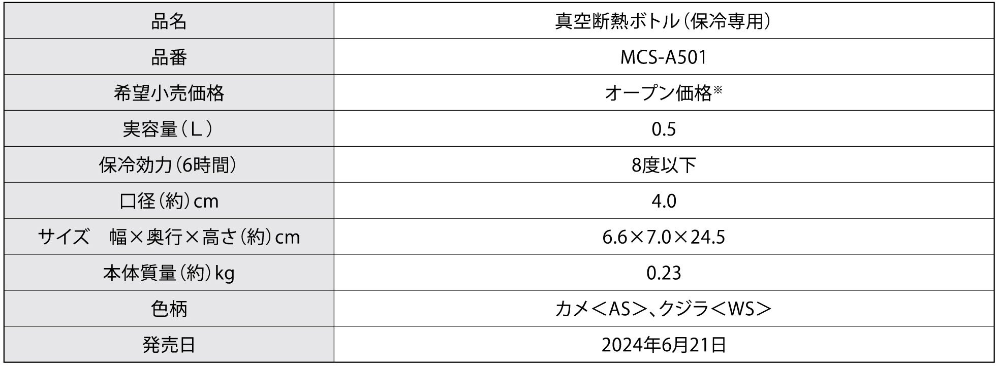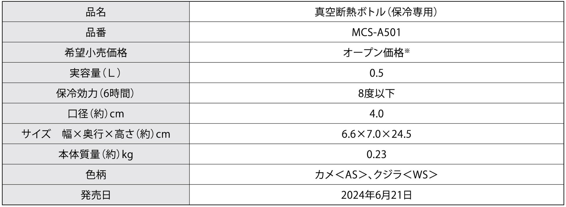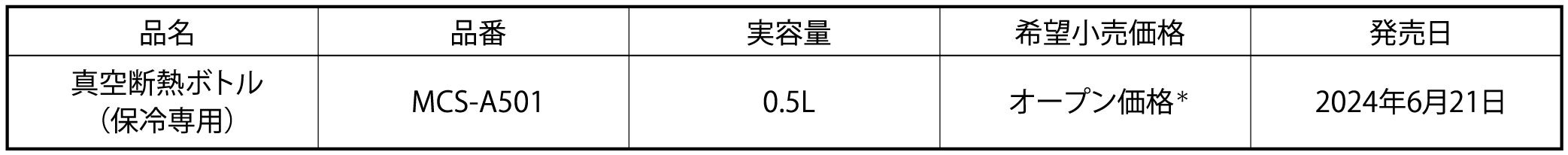 「真空断熱ボトル(保冷専用)MCS-A501」 詳細・ご購入はこちら: