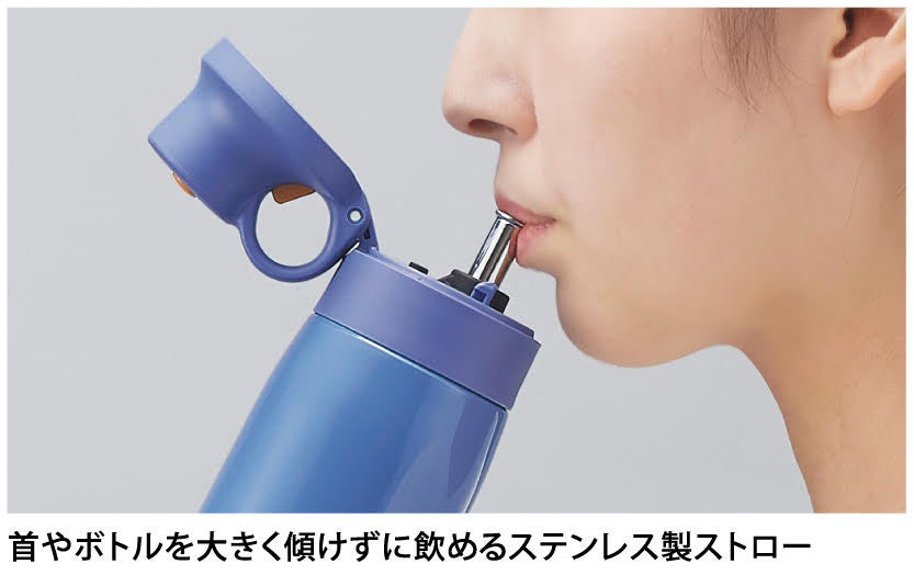 衛生的に使用できるステンレス製ストローを採用。飲む際にボトルを大きく傾ける必要がなく、らくにお飲みいただけます。樹脂製ストローと比較して、汚れやにおいが残りにくく、丈夫で長くお使いいただけます。