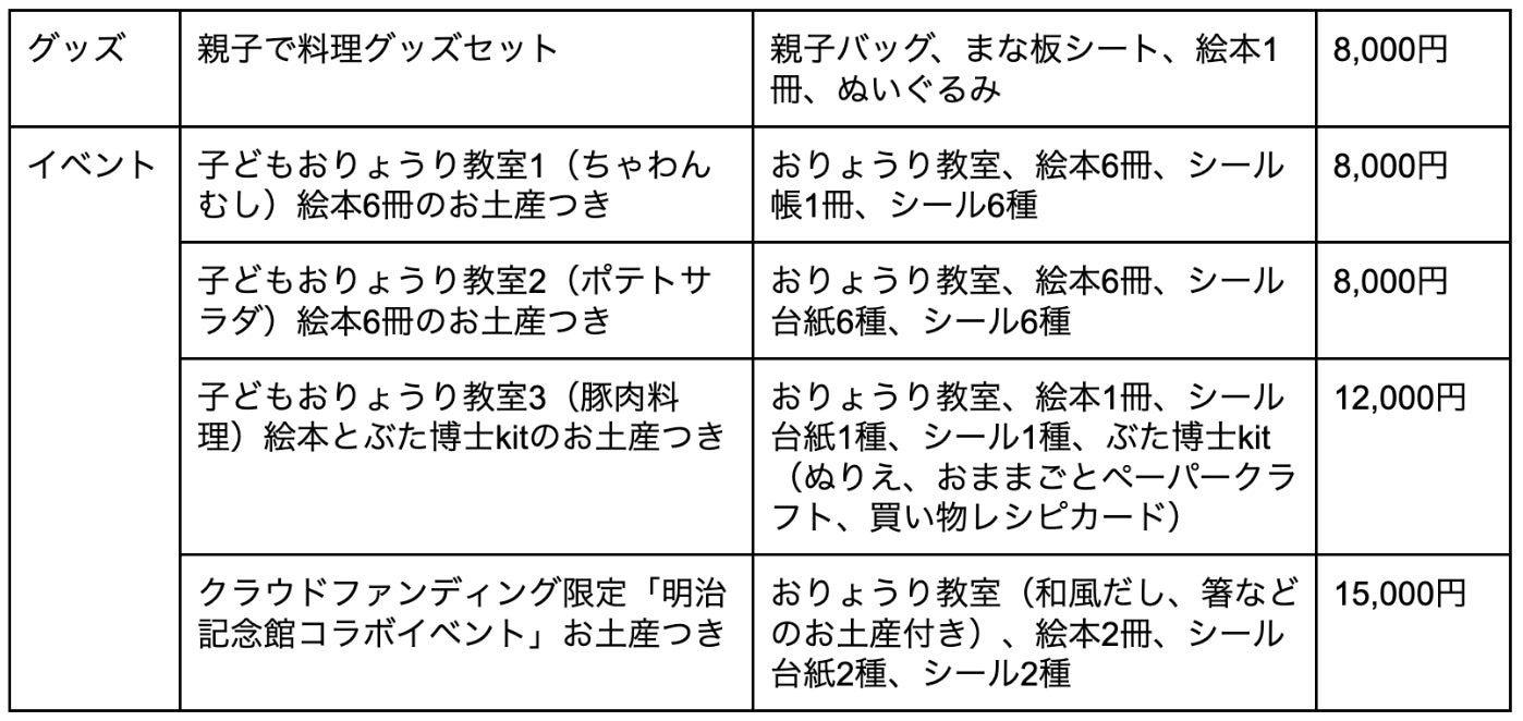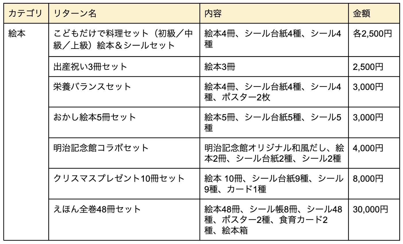 本プロジェクトでは、集まった支援をおりょうりえほんの食育活動に活かすだけでなく、返礼品として、通常サブスクリプションサービスで毎月届けている食育絵本のセットや、おりょうりえほんが主催する料理教室への参加権を、直接支援者に提供します。食育絵本やグッズは、海外在住の支援者にも届けることが可能です。