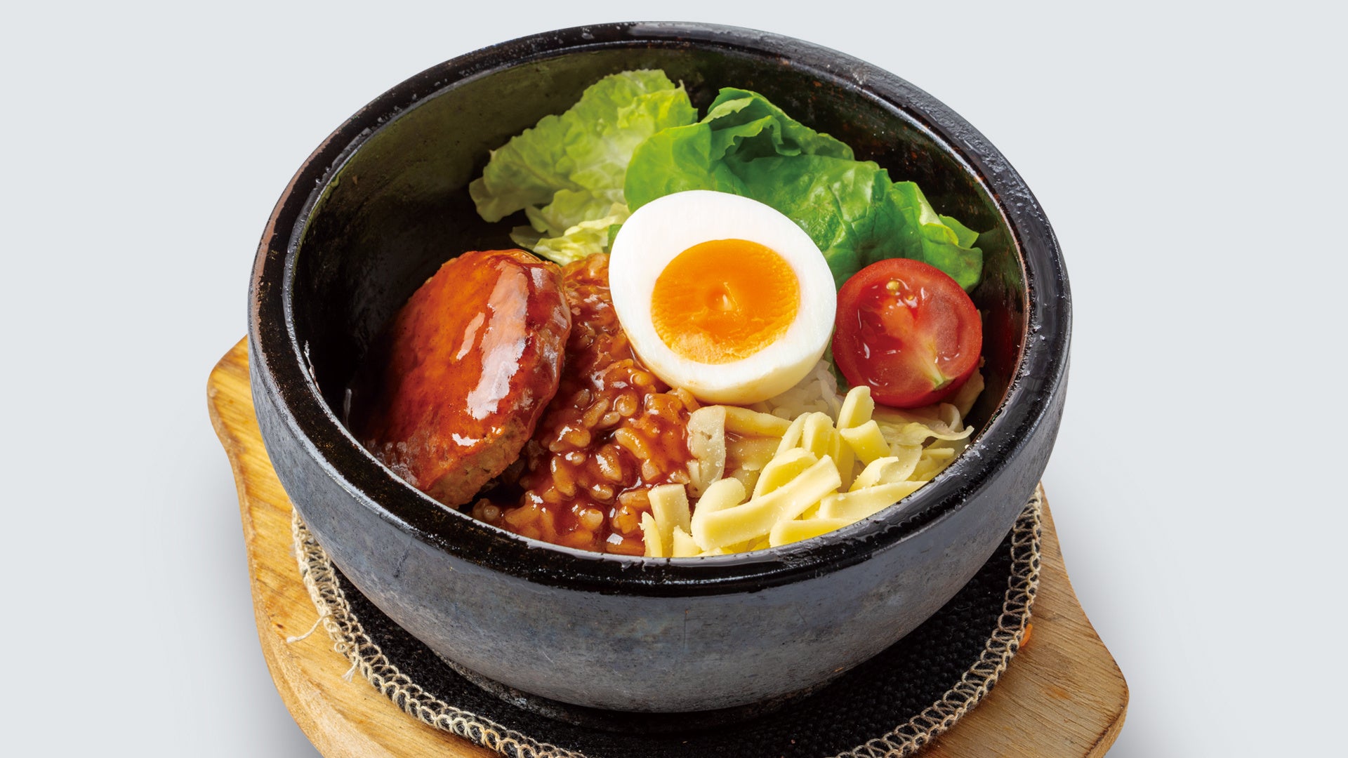 熱々の石鍋でハワイのローカルフードのロコモコを再現しました。