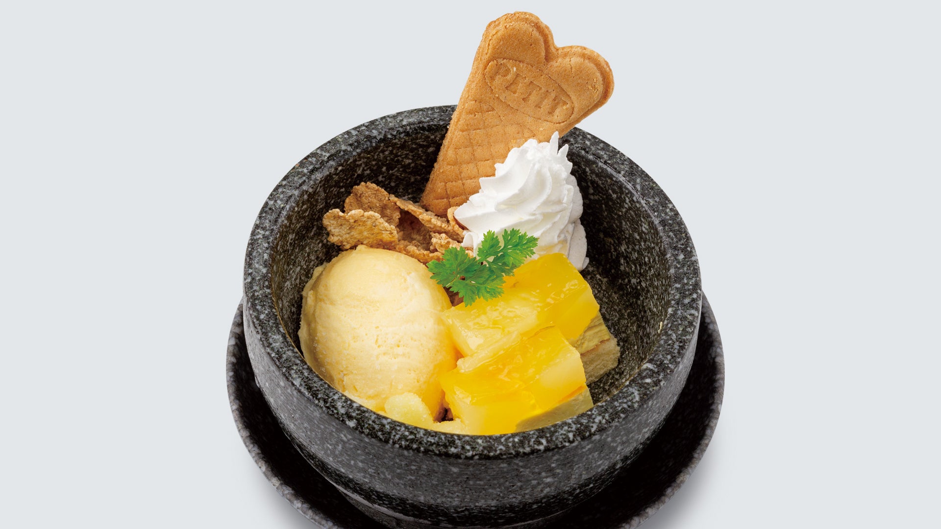 よく冷やした石鍋にバニラアイスやパインとマンゴー味のケーキトッピングを混ぜ合わせていただくデザートです。