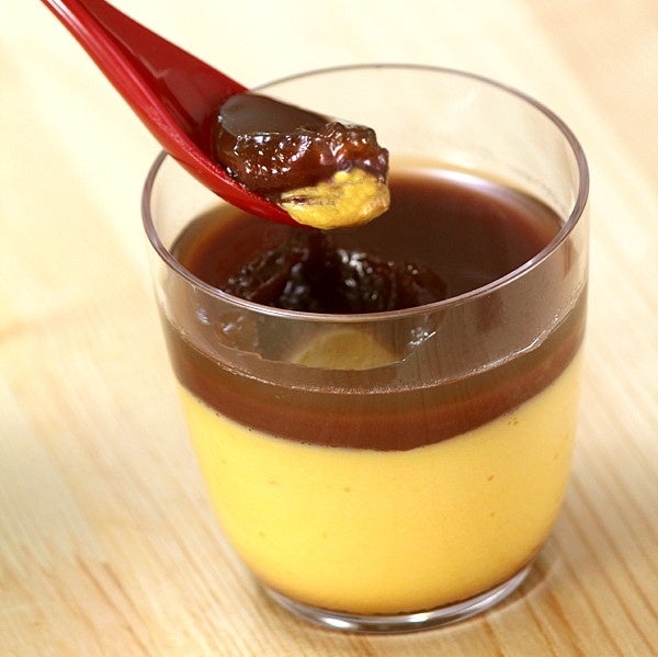 牛乳や卵などの基本材料に、くず餅の原料である450日間乳酸菌発酵させた小麦澱粉を加えることで、もっちり食感のプリンに仕上げました。また北海道のえびすかぼちゃを使用しており、素材の味を活かすために甘さ控えめでお作りしております。上掛けは船橋屋自慢のこし餡と黒蜜を混ぜた和風ゼリー。プリンの底にはカラメルも入っているため、最後まで飽きずにお召し上がりいただけます。