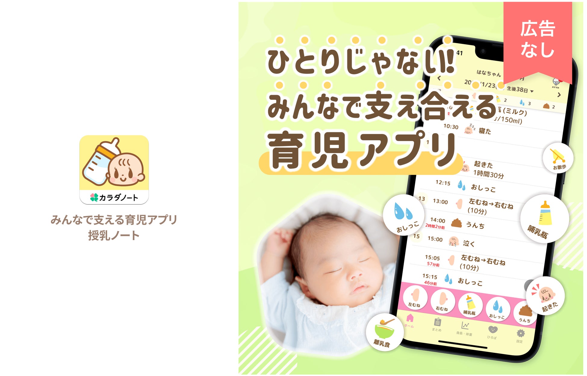 アプリ概要:授乳の時間帯・オムツ替えなど、片手で簡単記録!