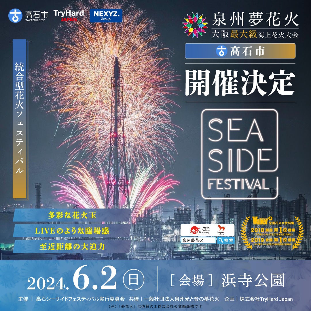 「泉州の観光資源創出による地方創生」をテーマに掲げ、2017年泉南での初開催から今年で5回目の開催を迎える、地域密着型の統合型花火花火大会「泉州夢花火」と、高石市の名所である浜寺公園で毎年開催されている、「高石シーサイドフェスティバル」が共催し、高石シーサイドフェスティバルのフィナーレを飾る注目コンテンツである打上花火を、「泉州夢花火in高石シーサイドフェスティバル」としてブラッシュアップして開催いたします。