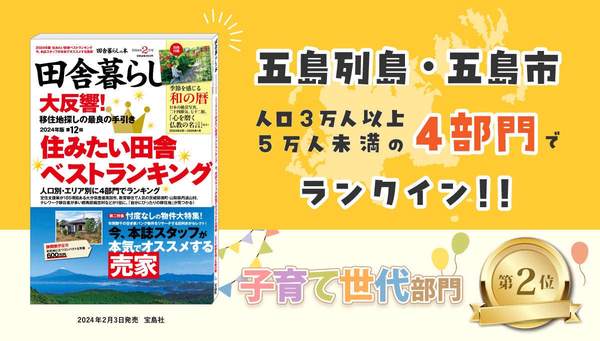 五島列島・五島市が4部門でランクイン!宝島社『田舎暮らしの本』2月号、「2024年版 住みたい田舎ベストランキング」(人口3万人以上5万人未満のまち)