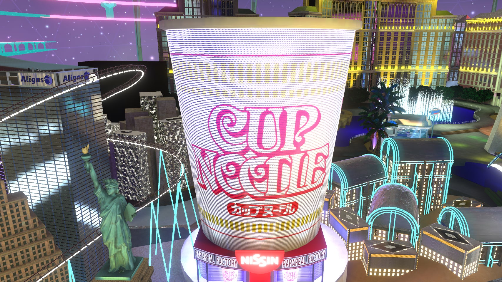 本イベントに、日清食品株式会社の初出展が決定。企業出展会場となる、「パラリアルラスベガス」の街に「カップヌードル」をモチーフとした大型ブースを出展。「カップヌードル」の工場見学体験や、VRならではの演出が楽しめるオリジナル脱出アクションゲーム、フォトスポット、おみやげコーナーなどを展開します。