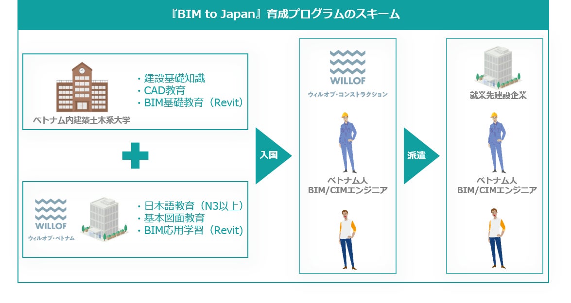 今回のBIM/CIMエンジニア人材育成プログラムは、プログラム参加を希望するベトナムの建築土木系大学の在学生/卒業生を対象に、当社グループ会社で現地法人の「ウィルオブ・ベトナム」が、日本のゼネコン・サブコン・メーカーなど建設現場で必要な「BIM/CIMエンジニアリングスキルおよびN3以上の日本語スキル」の教育を提供します。プログラムを修了した希望者は、在留資格「技術・人文知識・国際業務」ビザを取得の上2025年5月以降当社正社員として入社し、BIM/CIMエンジニアを求める日本国内の当社顧客企業に派遣配属されます。