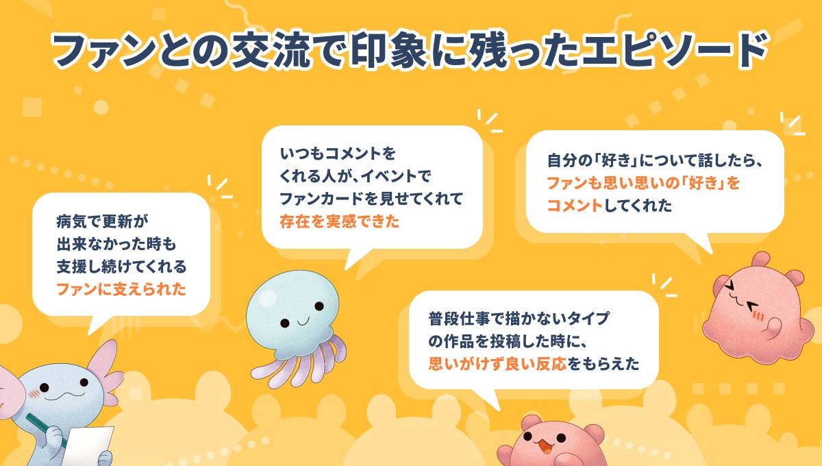 ファンとの交流で印象に残ったエピソードとしては、「普段仕事で描かないタイプの作品を投稿した時に、思いがけず良い反応をもらえた」「自分の『好き』について話したら、ファンも思い思いの『好き』をコメントしてくれた」という声がありました。金銭的な支援だけではなく、ファンとの交流がクリエイターのモチベーションとなり、創作活動を支えています。
