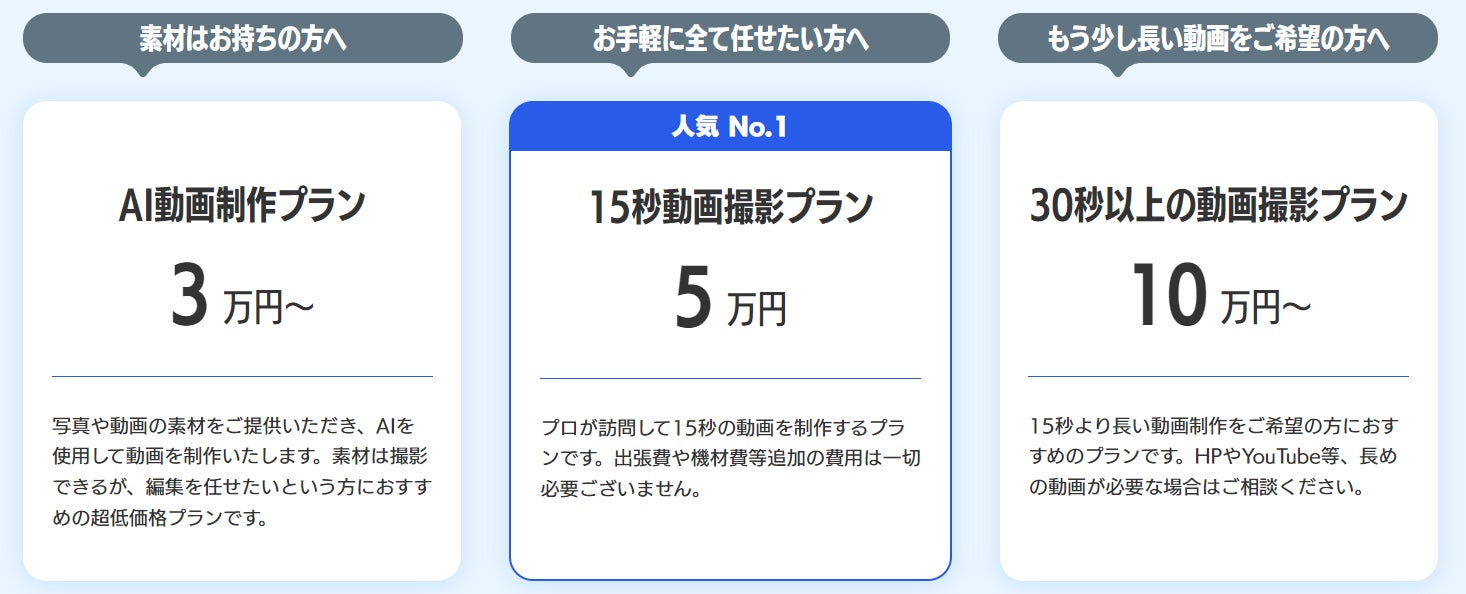 AI動画制作(3万円~)と訪問撮影制作(5万円~)の2パターンで低価格で提供します。 -
