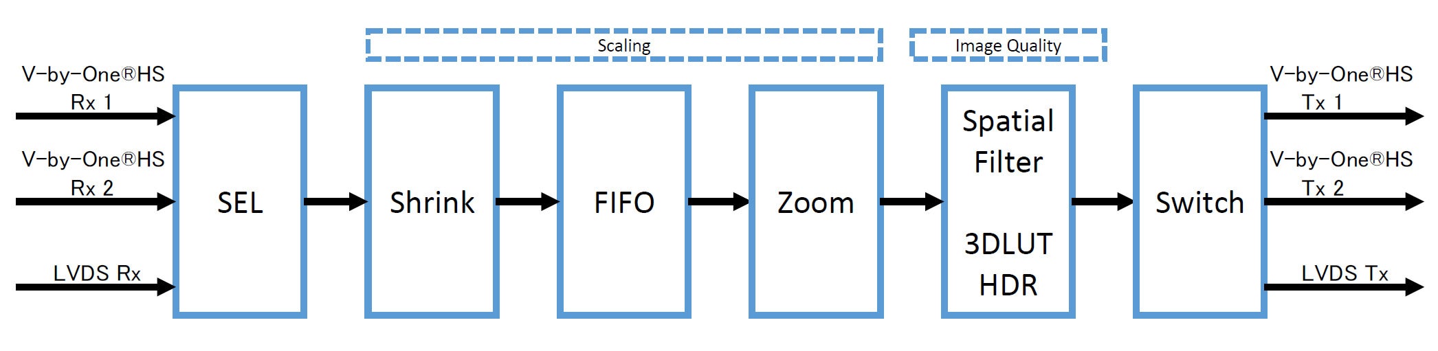 画像入出力(4K60Hz 3系統) | ・RGB 30bit / YUV4:4:4 30bit / YUV4:2:0 30bit / YUV4:2:2 20bit @V-by-One®HS 4Gbps, 8 lane 2系統 @LVDS (160MHz x 4 FPD-LINK) 1系統 ・最大4K60Hz画像1系統入出力(入力3系統、出力3系統から任意の経路を選択) |