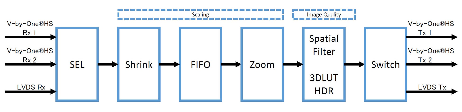 解像度変換機能 | ・拡大/縮小 6シンボル補間フィルタ搭載 ・係数ROM内蔵(64set) ・333Mpix/sec 2ch, 4K60Hzを1画面処理可能 |
