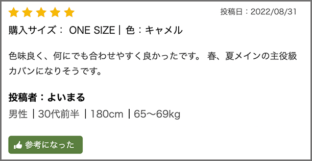 購入検討者は自分と同じ年代・身長・体重のレビュアーによるレビューを参考にすることでサイズの不安などを解消し購買検討が可能です。