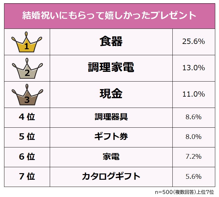 既婚者500人に「結婚祝いにもらって嬉かったプレゼント」を聞いたところ、圧倒的1位は「食器(25.6%)」です。2位「調理家電(13.0%)」、3位「現金(11.0%)」、4位「調理器具(8.6%)」が続きます。