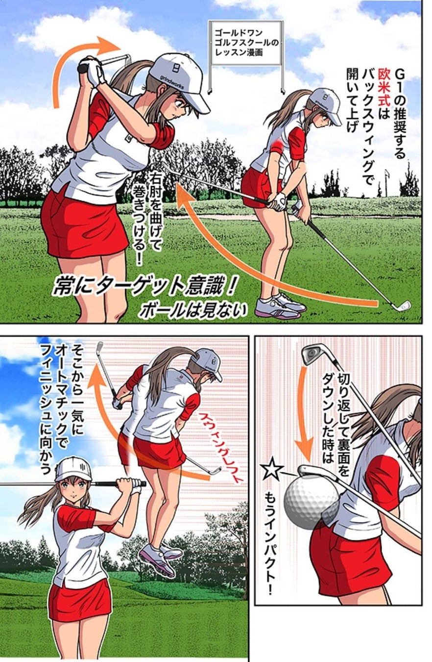 具体的なスウィングは、日本式は切り返しからダウンスウィングでクラブフェースをボールに向けて下ろし、リストターンをしてボールを打ちます。欧米式はフェースの向きを変えず、ボディターンで打っていきます。日本式に比べ動きがシンプルになるため、ボールに当てるミート率がよくなり、飛距離アップにつながります。