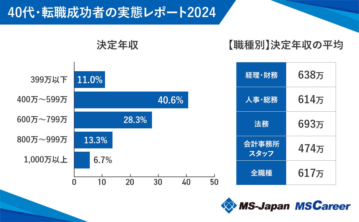 株式会社MS-Japan(本社:東京都千代田区 代表取締役会長兼社長CEO:有本隆浩/以下MS-Japan 証券コード:6539)が運営する、管理部門・士業の総合転職サービス「MS Career(エムエスキャリア)」は、「40代・転職成功者の実態レポート2024」を発表しましたので、お知らせいたします。本調査は、2023年1月1日~2023年12月31日にMS Careerが提供する人材紹介サービス「MS Agent」を活用して転職先を決定した40代の方のデータから、雇用実態についてまとめたものです。