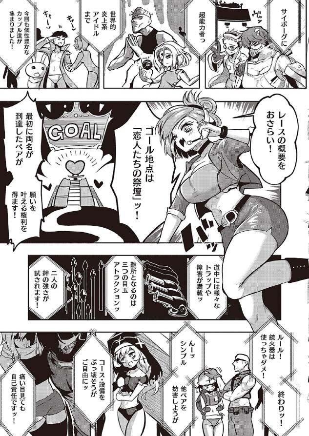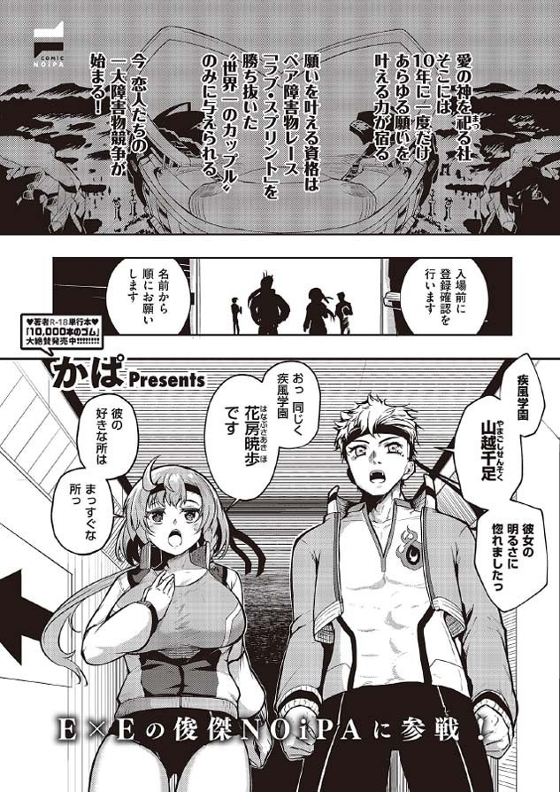 愛の神を祀る社。そこには10年に1度だけあらゆる願いを叶える力が宿り、その願いを叶える資格は恋人同士がペアを組んで挑む大障害物レース『ラブ・スプリント』を勝ち抜いた”世界一のカップル”のみに与えられるという。ラブラブだった彼女を自分が不能だったためにNTRれた過去を持つ男は、インポを治し彼女ともう一度愛し合うため…、忍の里出身のくノ一は衰退する一族の未来を賭けて…、何の取り柄もない女が世界的炎上系アイドルと釣り合うために…、様々な想いを賭けて今、恋人たちの一大障害物レースが始まる!!