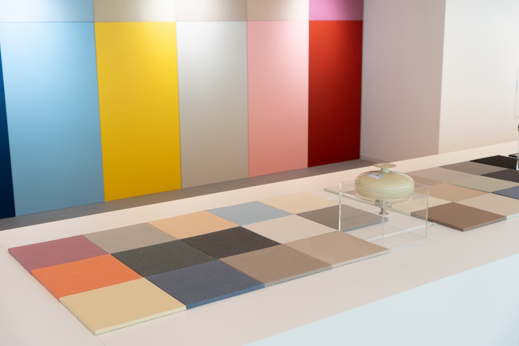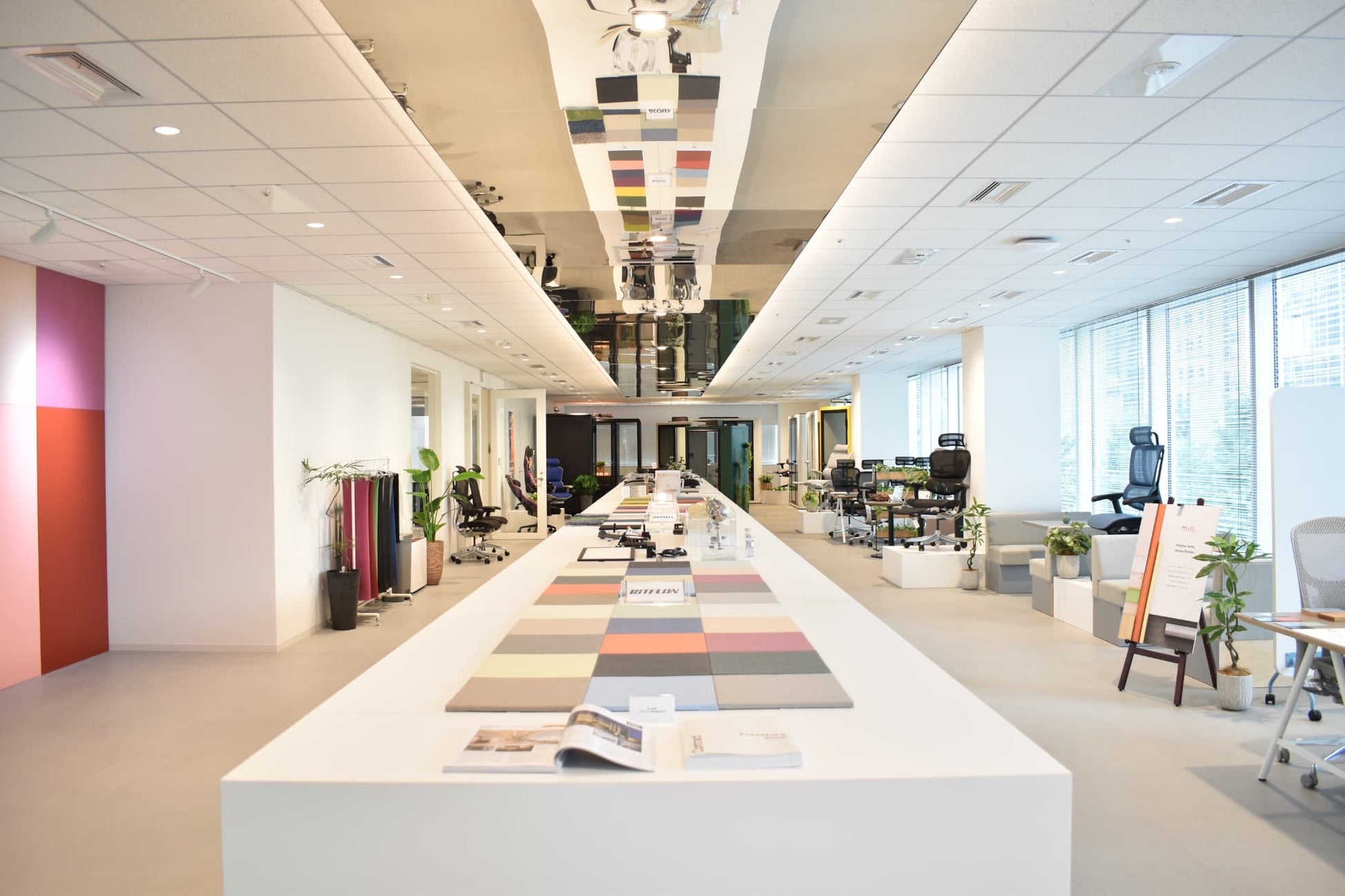 カラーシミュレーターでイメージを確認した後、関家具の東京京橋ショールームでは、外装スチールや内装パネルの実際の色味や素材感をサンプルで確認することも可能です。