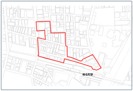 本エリアは西武池袋線「椎名町」駅に近接しています。築年数の経過した木造住戸などが密集しており、災害時などの緊急車両通行にも支障をきたす恐れがあり、東京都が定める「防災都市づくり推進計画」の重点整備地区に位置づけられています。
