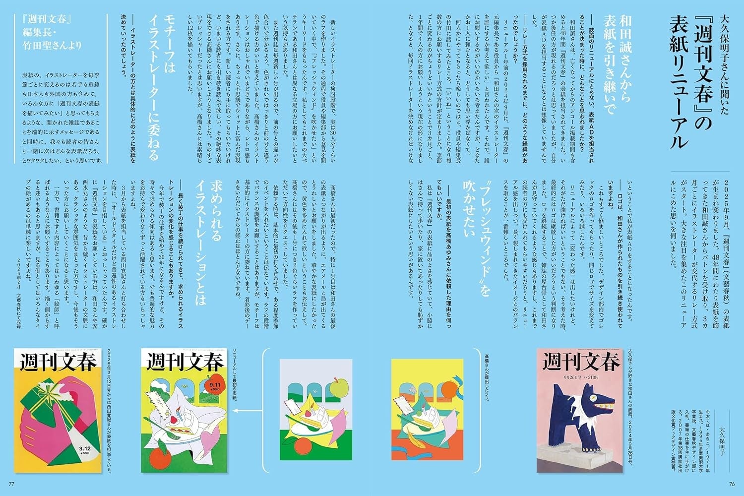 2025年9月にリニューアルされた『週刊文春』(文藝春秋)の表紙について、表紙ADを務める文藝春秋デザイン部・大久保明子さんにインタビュー。和田誠さんからバトンを受け継ぎ、3カ月ごとにイラストレーターが交代する新たな試みについて、その背景を伺いました。