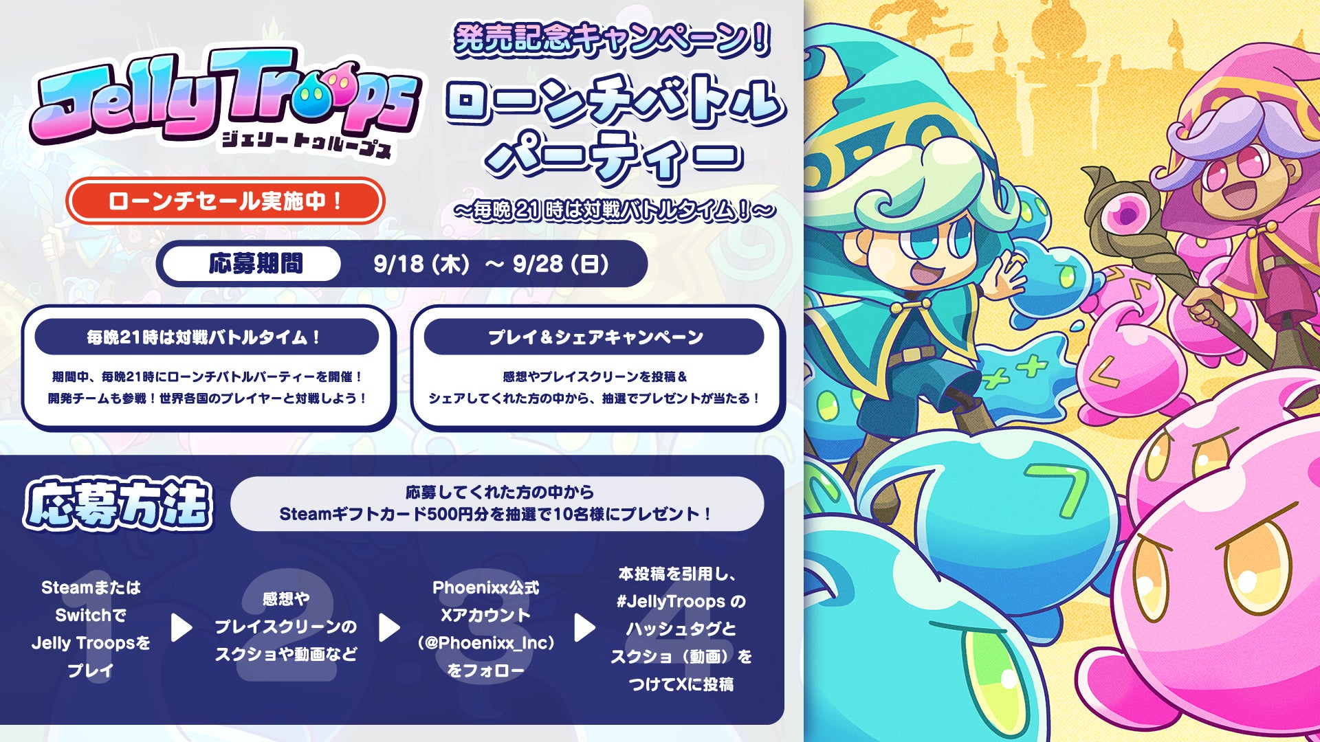 株式会社Phoenixx(フィーニックス)(東京都武蔵野市、代表取締役社長:坂本 和則)は、本日9月18日(木)より、ぷにぷに旗とりバトル『Jelly Troops』をSteamおよびNintendo Switch™向けに、配信開始したことをお知らせいたします。また、配信開始にあわせて、本日から期間限定で10%OFFのローンチセールおよびローンチ記念キャンペーンを実施いたします。