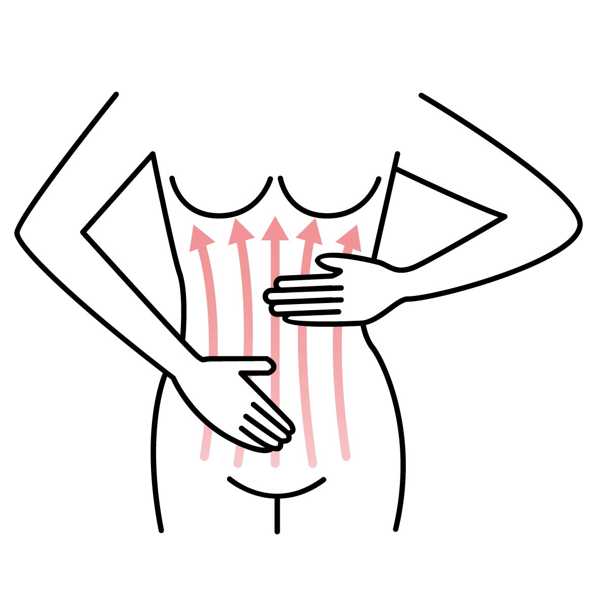 左右の手のひらで、交互に下腹部から胸の下にかけてすり上げます。脇の方は、ウエストをひねりながら行います。