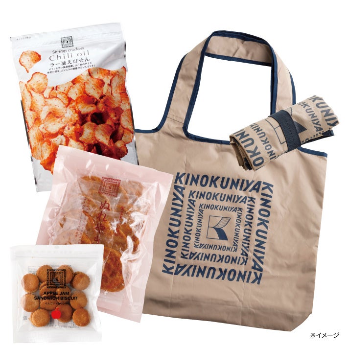 大人気の「ラー油えびせん」、醤油の香りとザクザク、モチモチの食感がたまらない「ぬれやき煎」、素朴な甘さがクセになる「りんごジャムサンド」、そしてコンパクトに折りたためる便利なバッグのセットです。