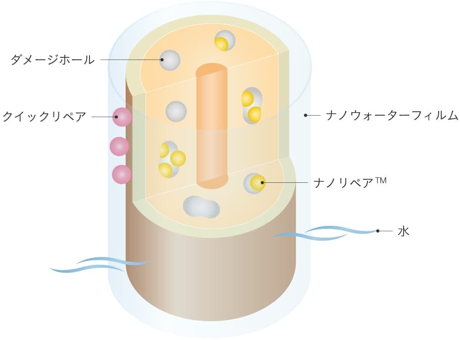 ナノウォーターフィルム※3 が洗いながらダメージヘアのキューティクルの接着を補強。ダメージヘアの広がりを抑え、まとまりとしっとり感を実現。ナノリペア™※4とクイックリペア※5により、髪の内外ダメージ補修効果を発揮します。