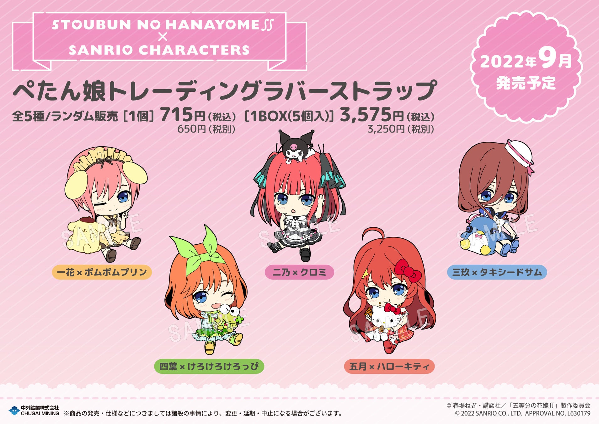 キャラクターグッズの商品企画・製作・販売を行う中外鉱業株式会社コンテンツ部は、TVアニメ『五等分の花嫁∬』より「ぺたん娘トレーディングラバーストラップ」サンリオキャラクターズコラボバージョンの販売を発表いたします。2022年9月発売予定となります。