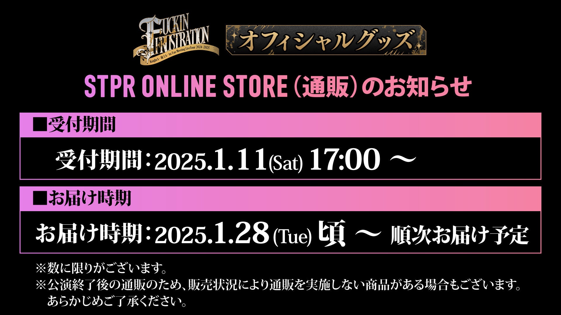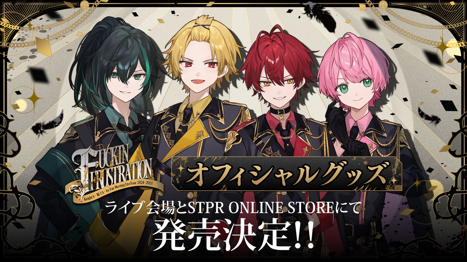 株式会社STPR (本社:東京都渋谷区 代表:柏原 真人、以下STPR)は、所属のビジュアル系2.5次元歌い手グループ「Knight A - 騎士A -」による自身初のファンミーティング『Knight A - 騎士A - 1st Fan Meeting LiveTour 2024-2025「FUCKIN FRUSTRATION」』にてオフィシャルグッズの販売を決定したことをお知らせいたします。