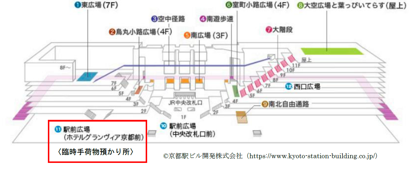 京都駅(駅前広場(ホテルグランヴィア京都前))において、臨時手荷物預かり所を開設し、手荷物の一時預かりを行います。また、手荷物預託情報サイト「ecbo cloak」(運営:ecbo株式会社)において事前予約を受け付けます。