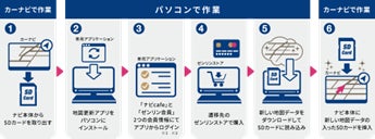 カーナビ本体からSDカードを取り出し、PCにインストールした地図更新アプリから新たなデータをダウンロードのうえSDカードに読み込み、ナビ本体に挿入することで更新が完了します。