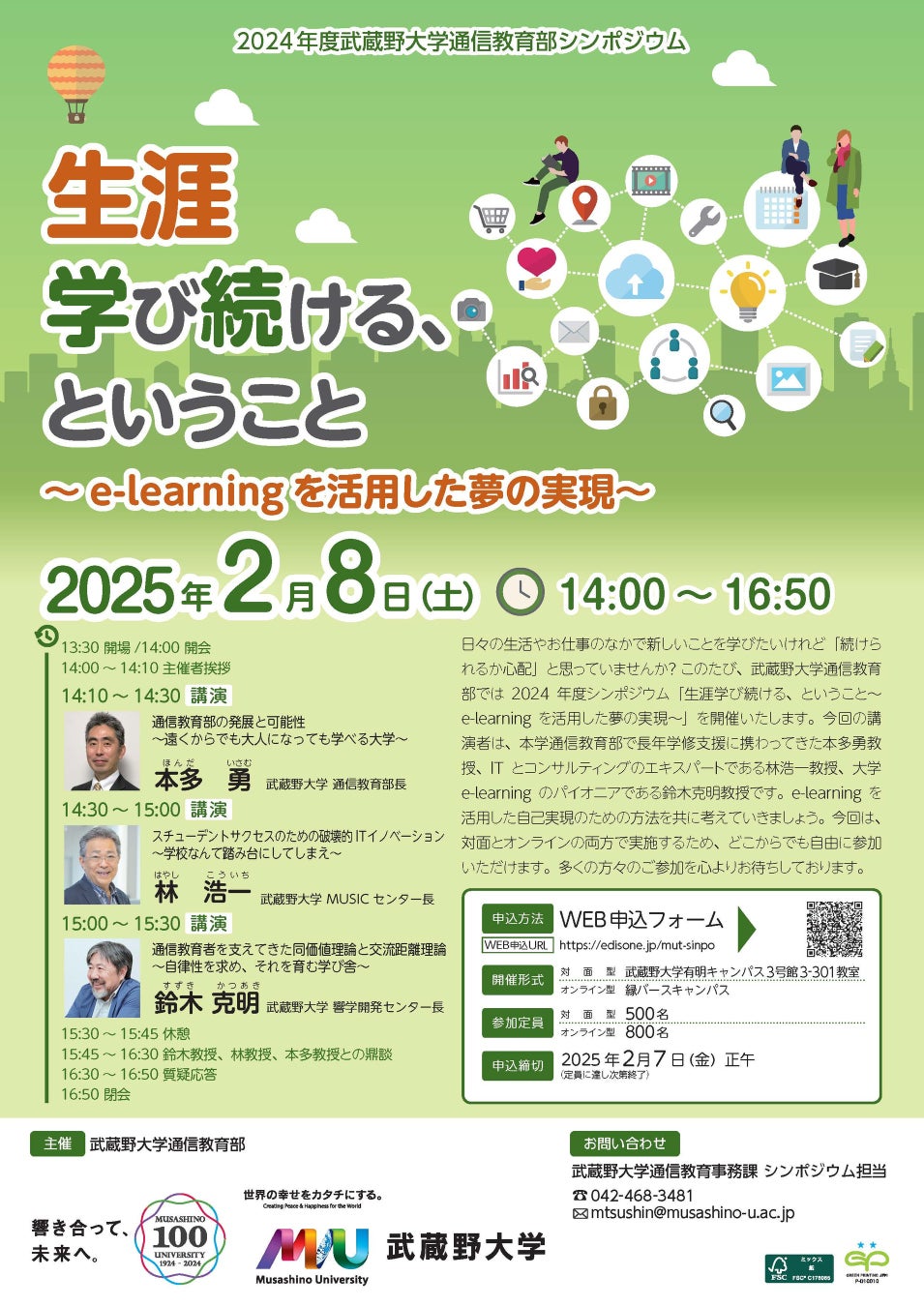 【武蔵野大学】2月8日(土)に通信教育部シンポジウム「生涯学び続ける、ということ~e-learning を活用した夢の実現~」を開催!