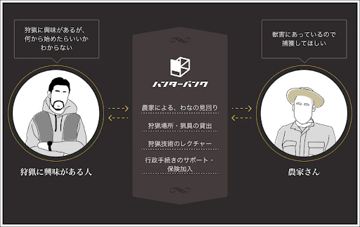 初心者ハンターが安心して独り立ちができることと、獣害に悩む農家さんの支援の2つが叶うサービスです。