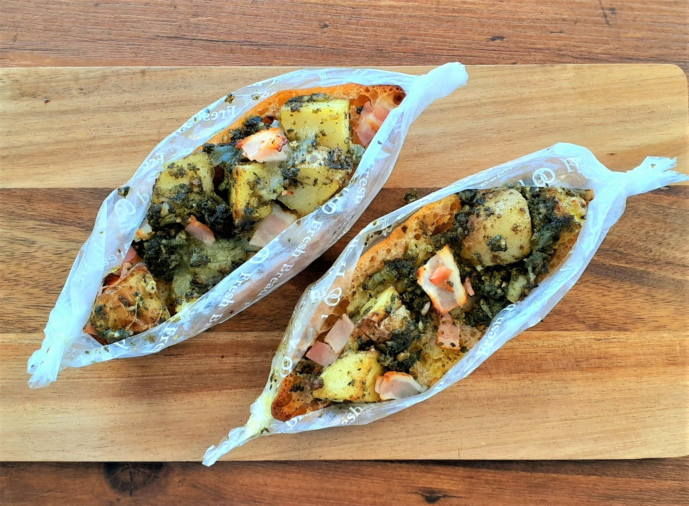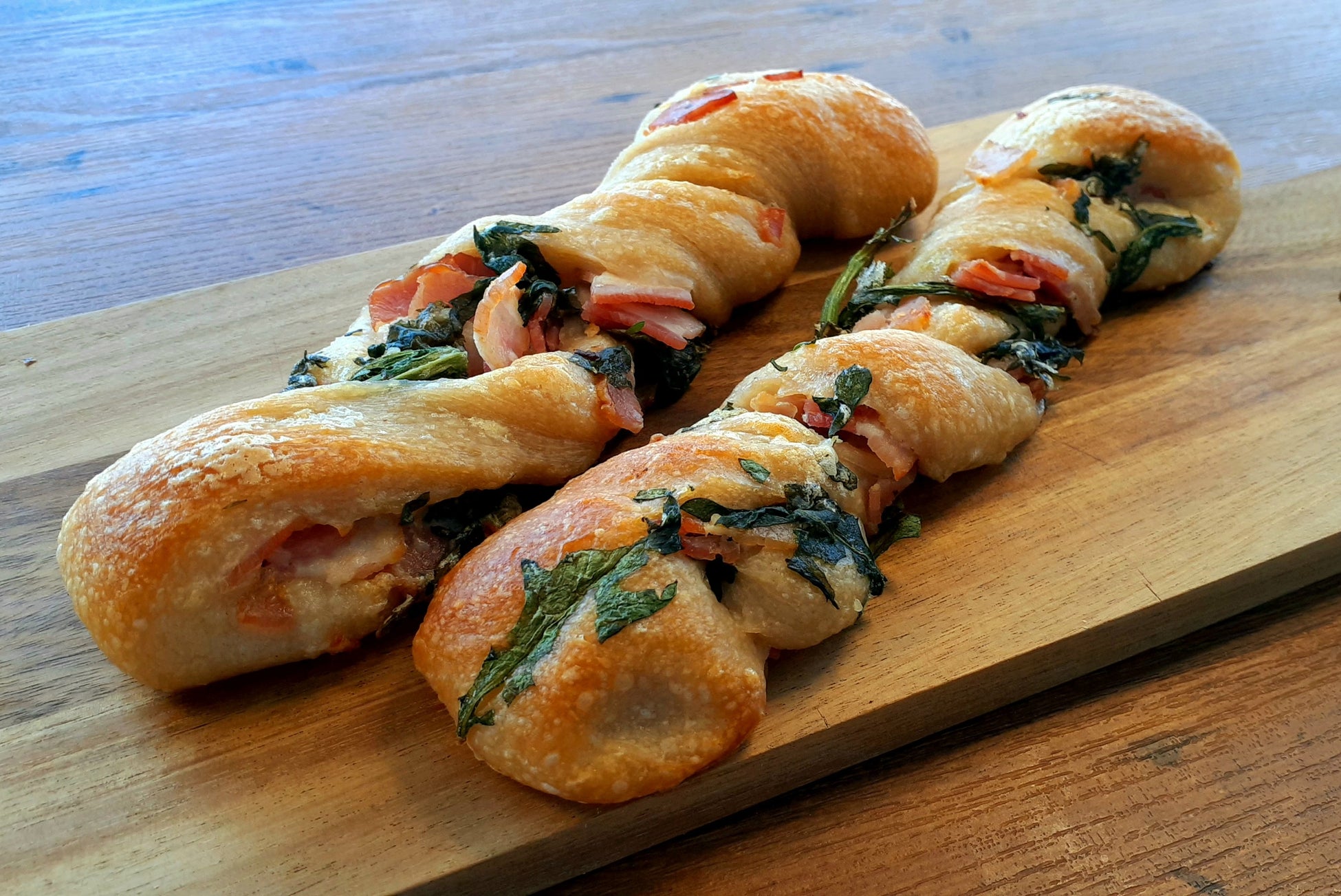 熟成させたベーコンをフランスパンの生地とエダムチーズで巻き込み、カリカリに焼きあげました。
