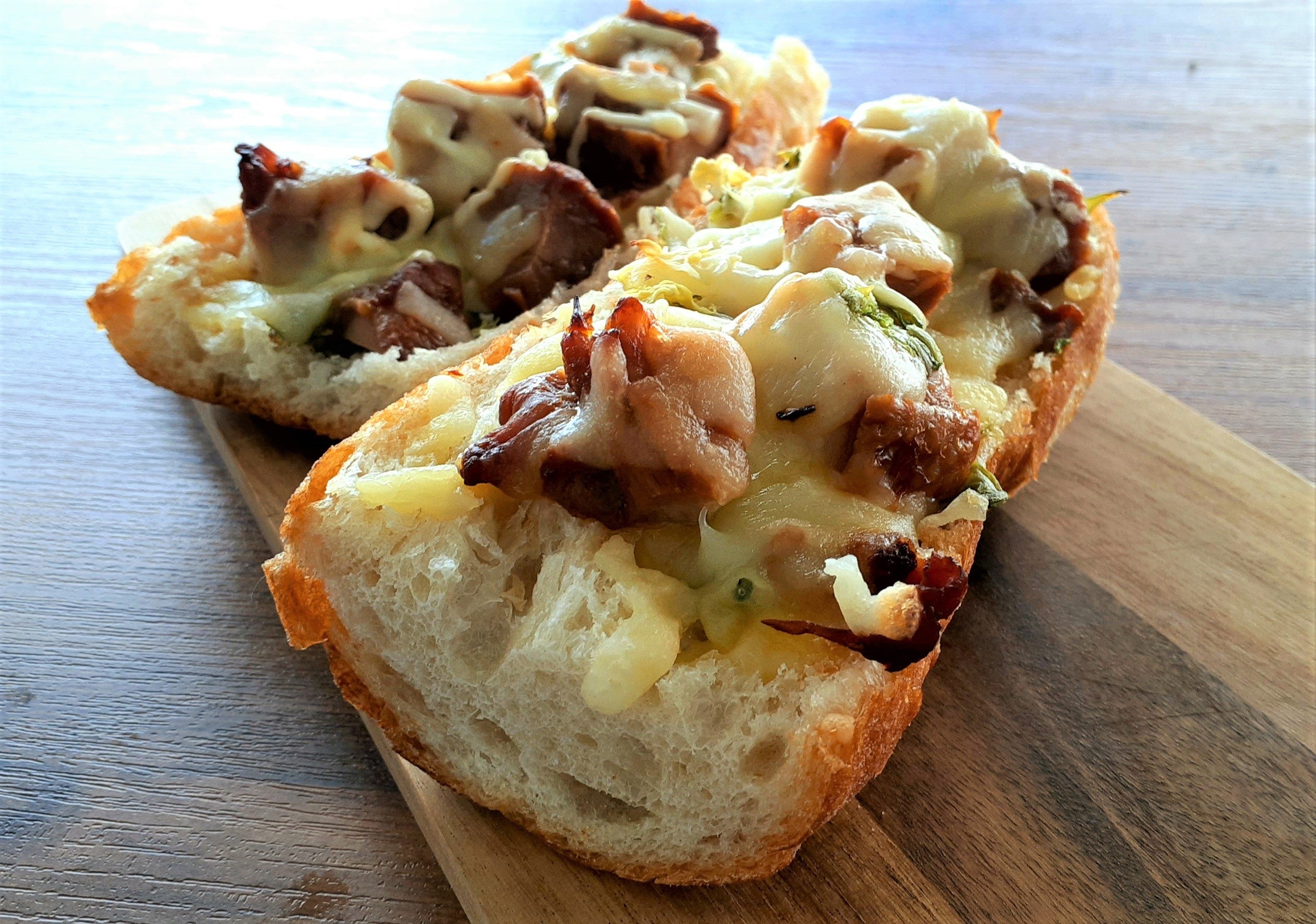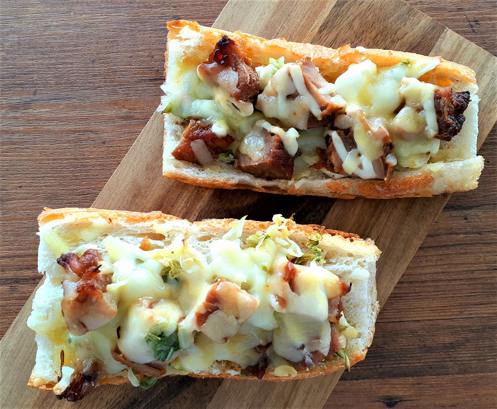 トマトソースを塗ったフランスパンに照り焼きチキン、とろとろチーズをトッピングしました。