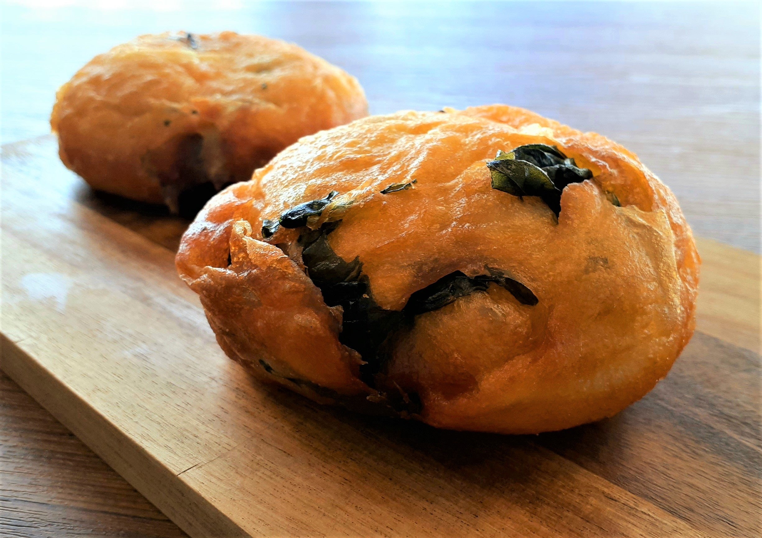 スイスチャードを練り込んだ生ドーナツ生地で風味豊かなキーマカレーを包みこみました。