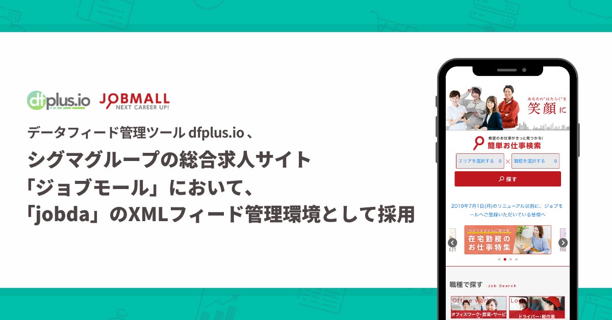 株式会社フィードフォース(所在地:東京都港区、代表取締役:塚田 耕司、以下「フィードフォース」)が提供する データフィード管理ツール「dfplus.io」が、シグマホールディングス株式会社(所在地:東京都品川区、代表取締役社長:平澤 志奈)が運営する総合求人サイト「ジョブモール」において、ジョブダ株式会社(所在地:東京都港区、代表取締役社長:中村 陽祐、グリー株式会社100%子会社)の求人検索エンジン「jobda」 の XML フィード管理環境として採用されました。