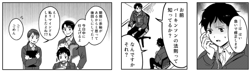 オリジナルコミックの制作ということで、当社として社員に伝えたかった「パーキンソンの法則」の概念や「終わりの時間を意識して仕事の質を上げる」といった方向性を、当社での日常的な場面に落とし込んでシナリオを作成していただくことができました。