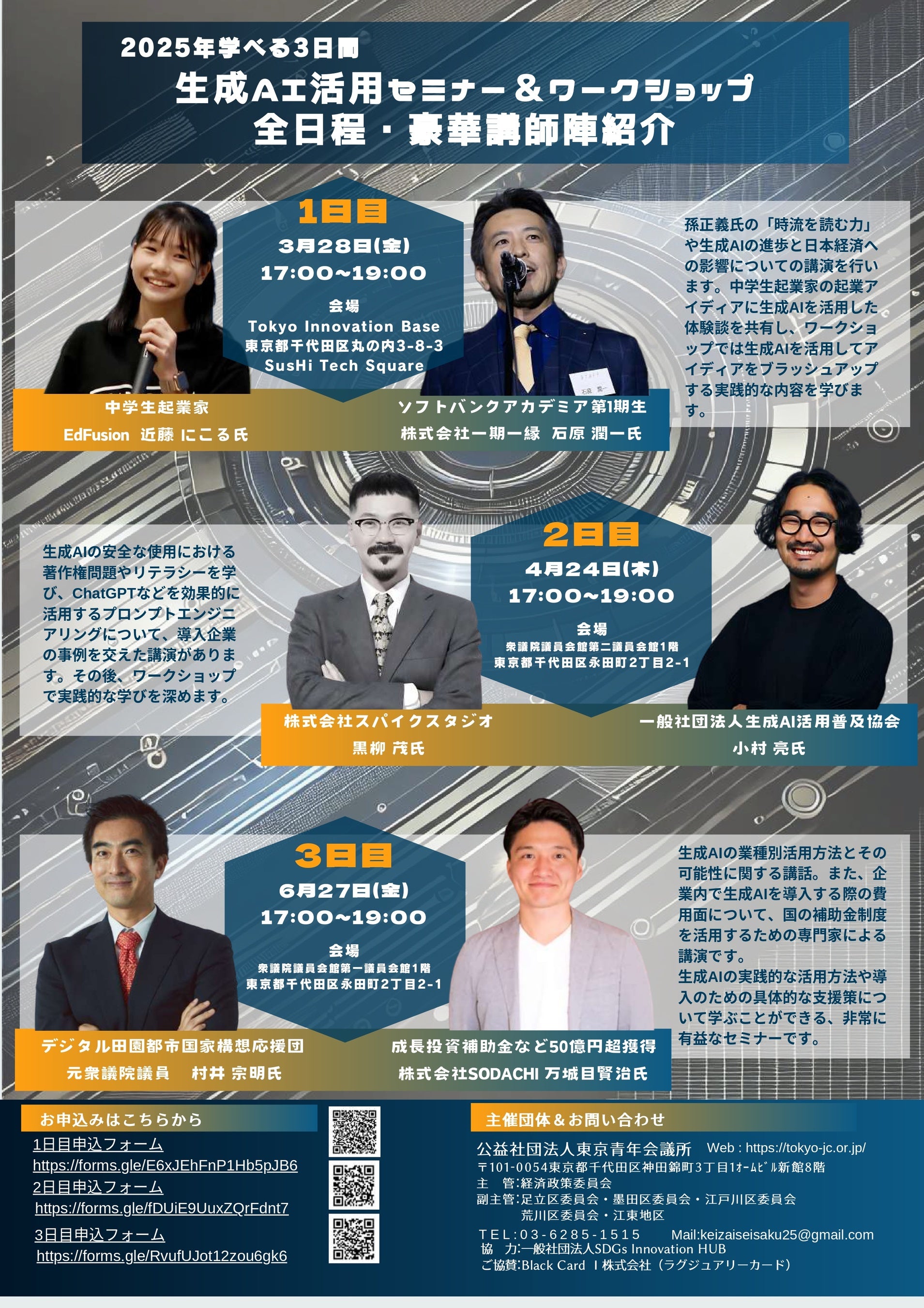 公益社団法人東京青年会議所(以下「東京青年会議所」)は、高齢化や人口減少といった社会課題に対応し、限られた人材で企業成長を図ることをテーマに、「生成AI活用セミナー&ワークショップ」の第3回目を2025年6月27日(金)に開催いたします。