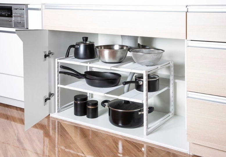 幅と棚の高さが調節でき、また排水管を避けて設置できるので、シンク下の空間を無駄なくスッキリ収納できるとお客様に大好評いただいている「シンク下収納ラック」イータ。