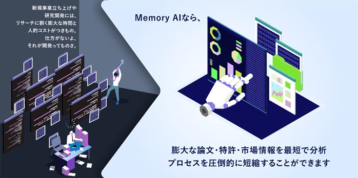 株式会社MEMORY LABは数多くの企業の研究開発に関わる中で、「専門性の高い膨大な情報を処理し、網羅的に領域を理解することは非常に困難であり、情報収集でさえ膨大な時間を要する」という課題感を持っていました。同社が開発した「Memory AI」は、企業の新規事業・研究開発の際に必要な技術情報収集・分析を効率化し、企業の研究開発を加速する研究情報探索エンジンを搭載した調査サービスです。