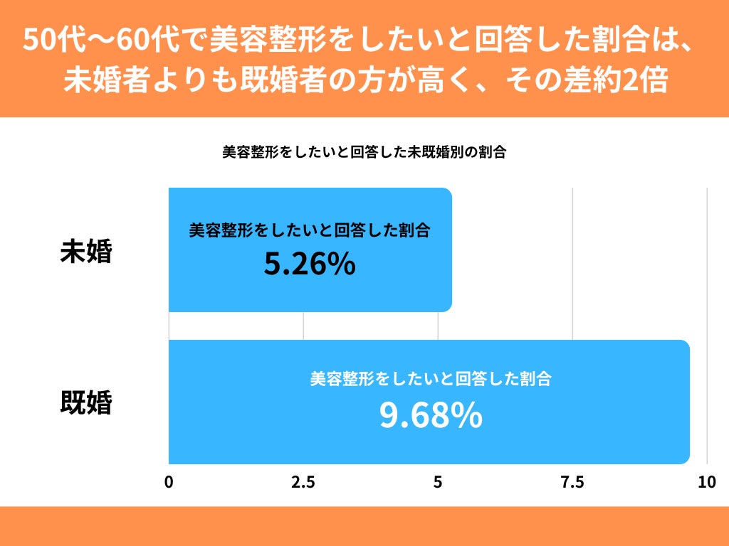 【50代〜60代で美容整形をしたいと回答した割合は、未婚者よりも既婚者の方が高く、その差約2倍】