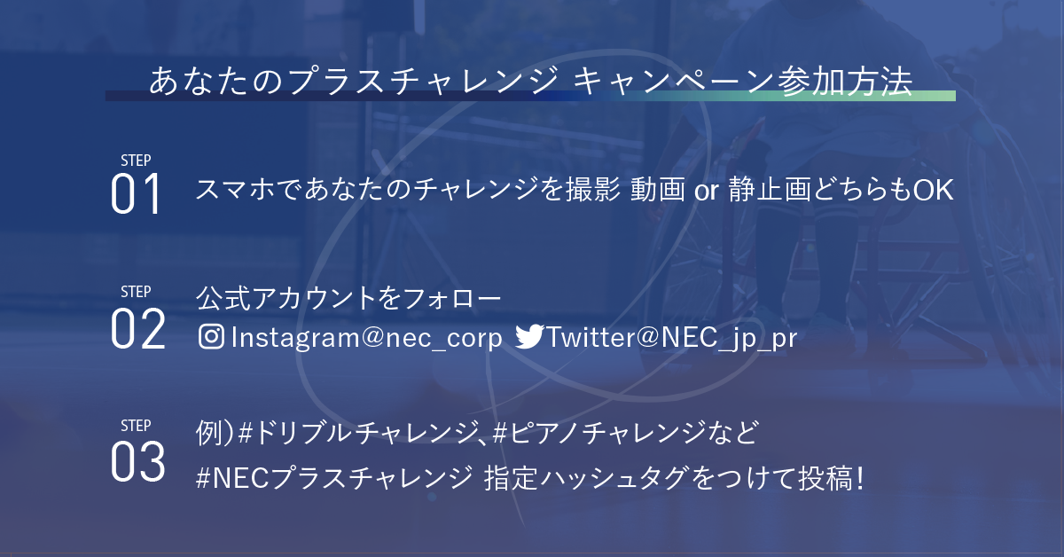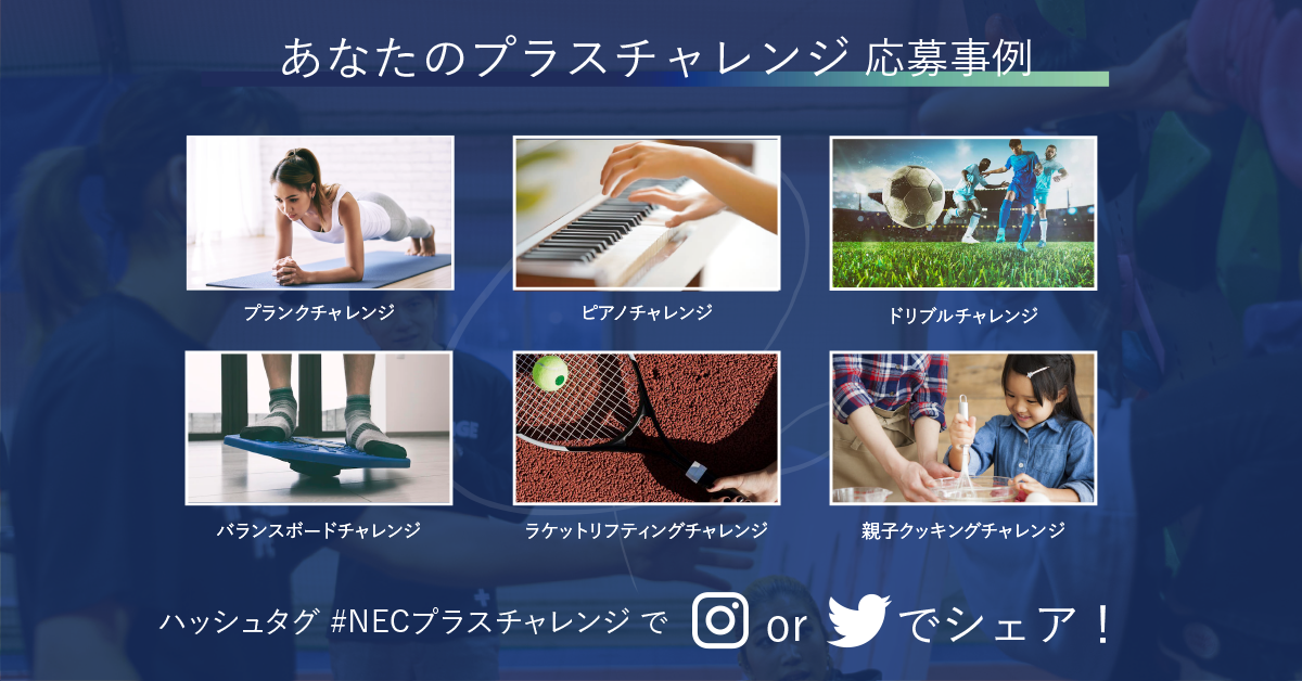 NEC公式Twitterアカウント「@NEC_jp_pr」かNEC公式Instagramアカウント「@nec_corp」をフォローし、指定ハッシュタグ「#NECプラスチャレンジ」で静止画か動画を投稿。Twitter か Instagramのダイレクトメッセージで当選連絡。後日郵送にて賞品送付。