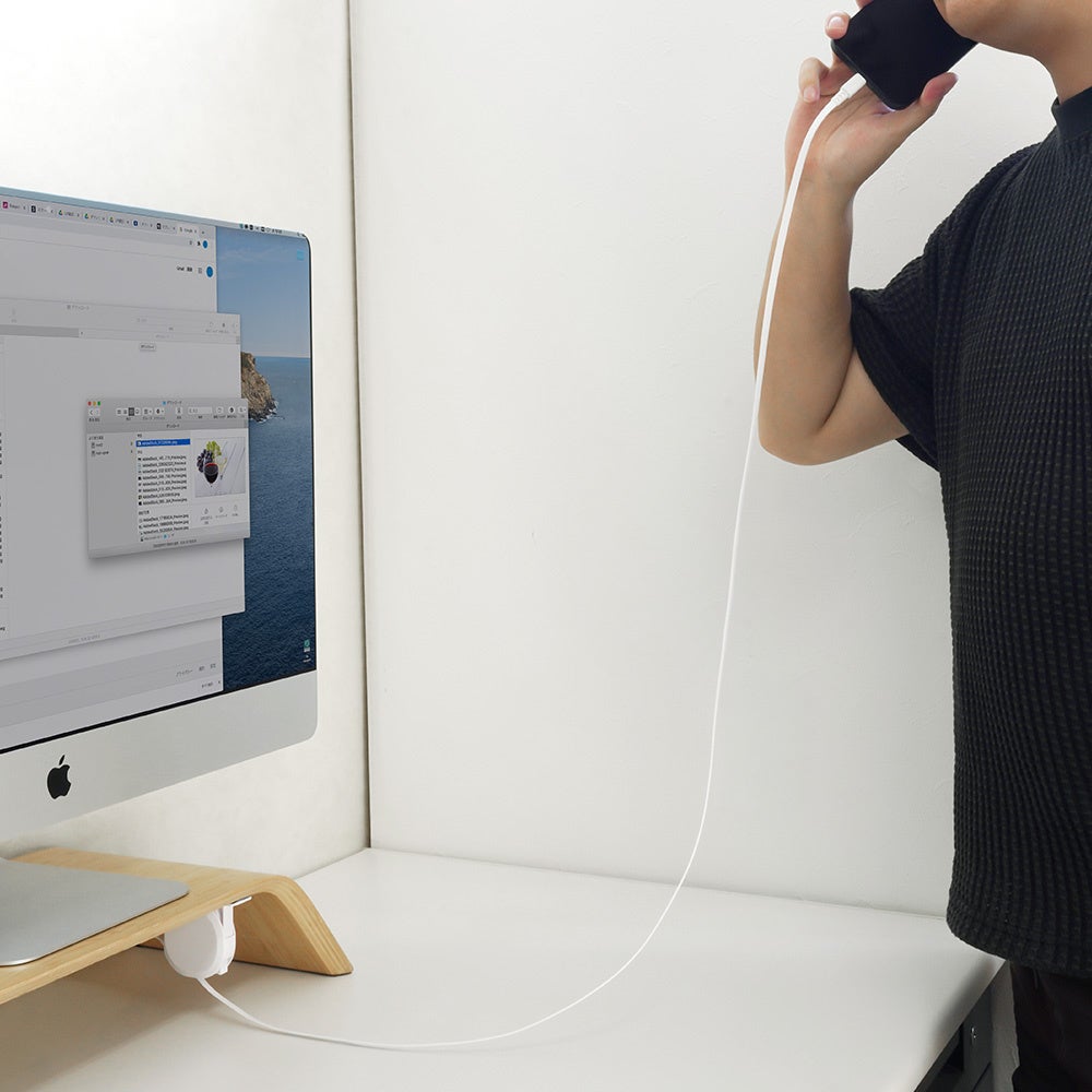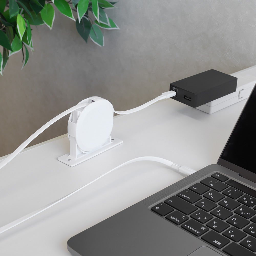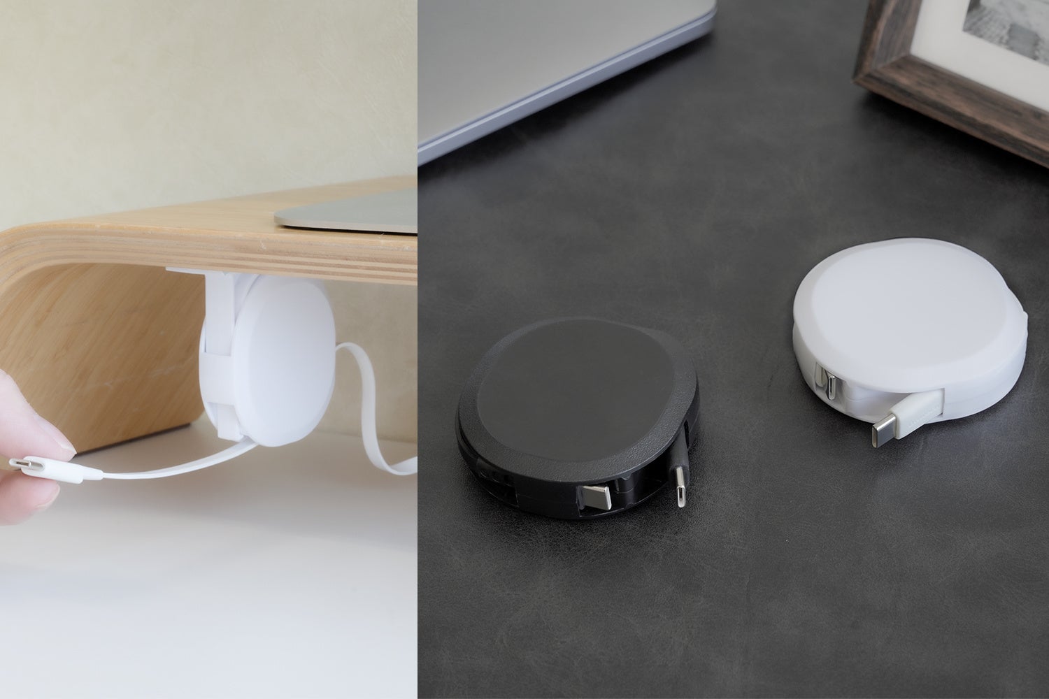 片方のケーブルだけが伸縮するからリール部分が邪魔にならず、デスク周りや外出先など多くのシーンで活躍します。手のひらに収まるサイズにケーブルを収納できるので持ち運びにも最適。